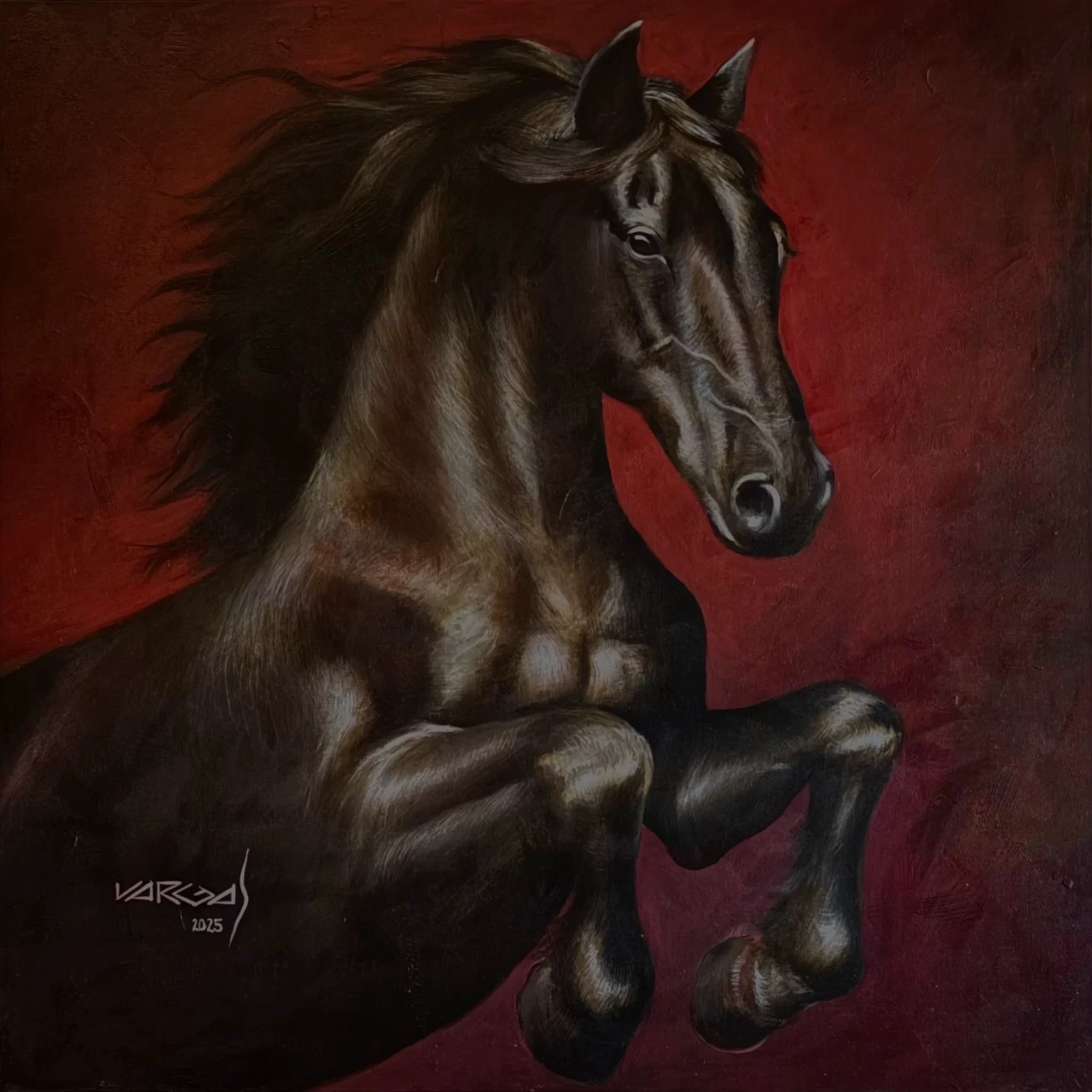 Pintura en acrílico elaborada sobre fondo de lienzo templado en bastidor, iniciando sobre fondo oscuro y sacando luces sobre la composición.