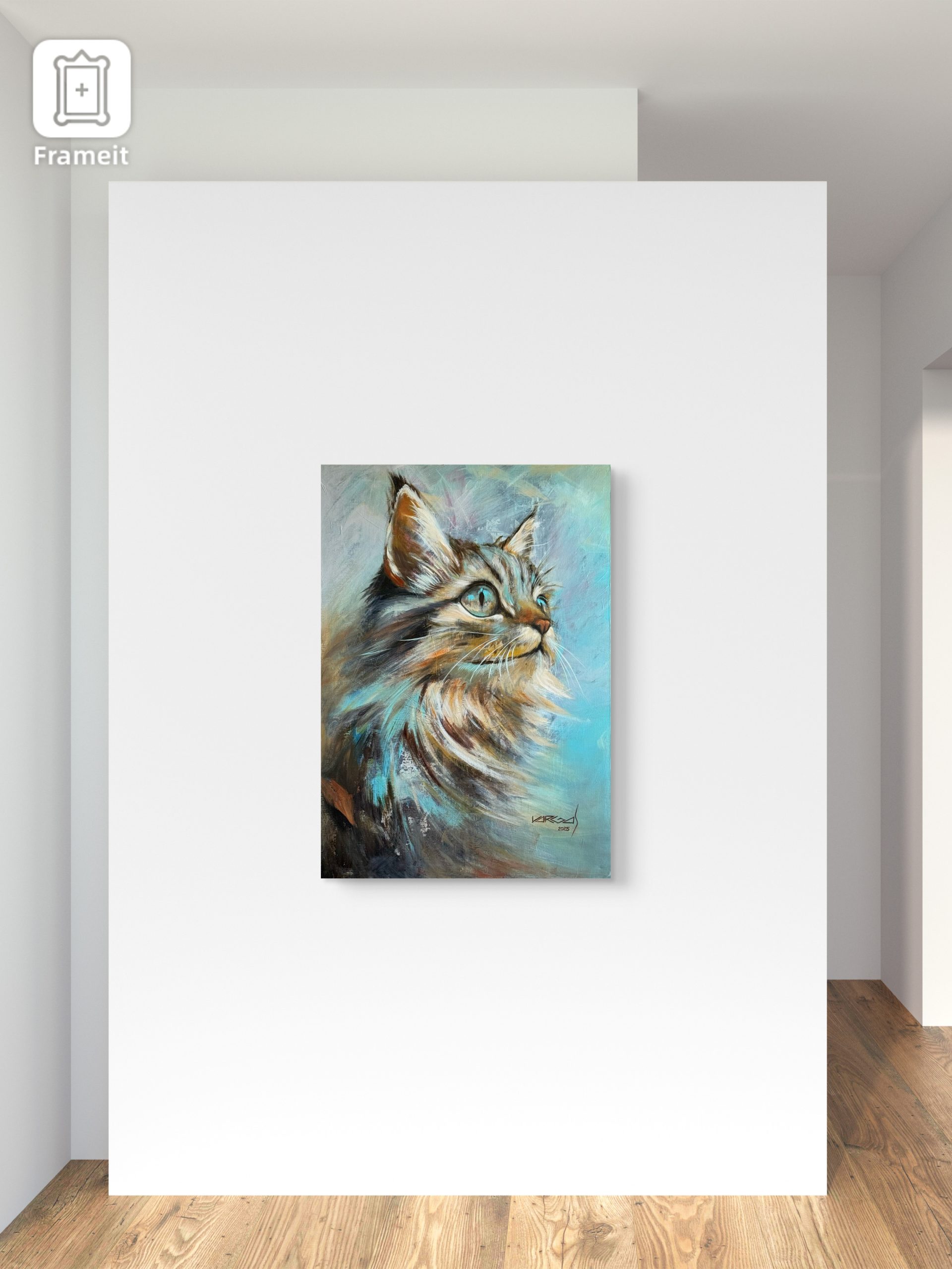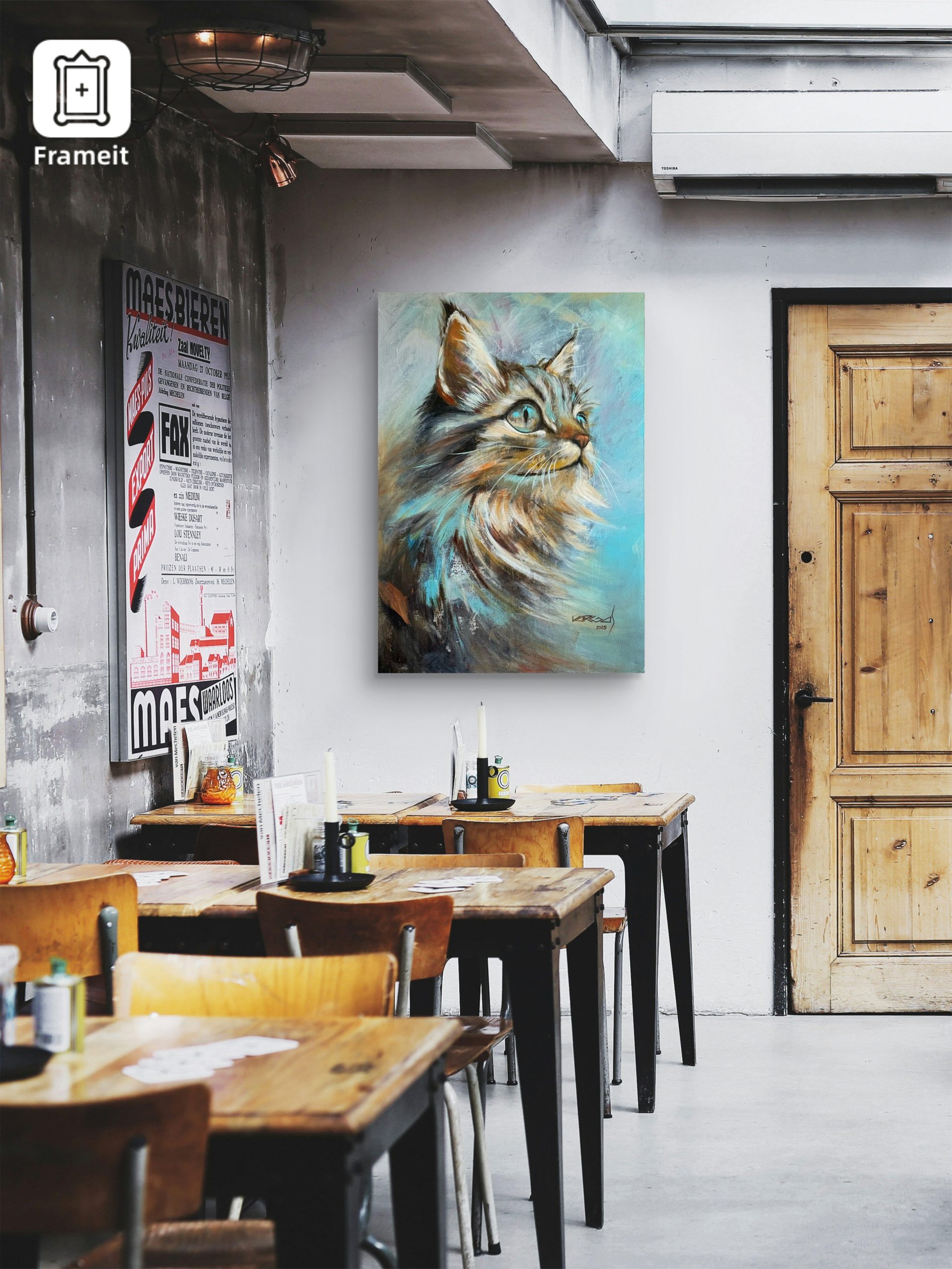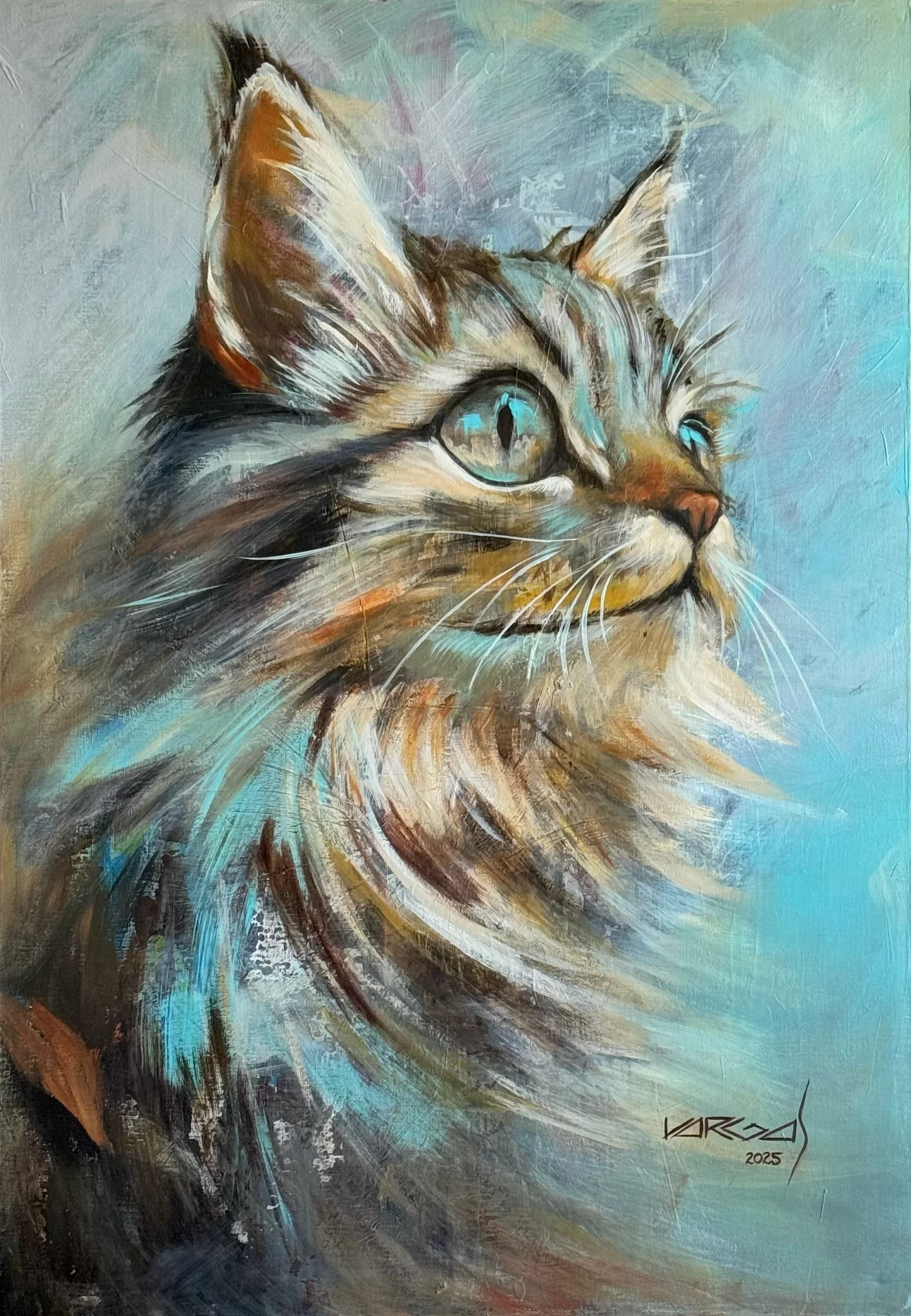Pintura en acrílico elaborada sobre fondo de lienzo templado en bastidor, texturizado inicial, y luego gestos fuertes y libres en tonos cafe y azul, destacando la atención de la mirada felina.