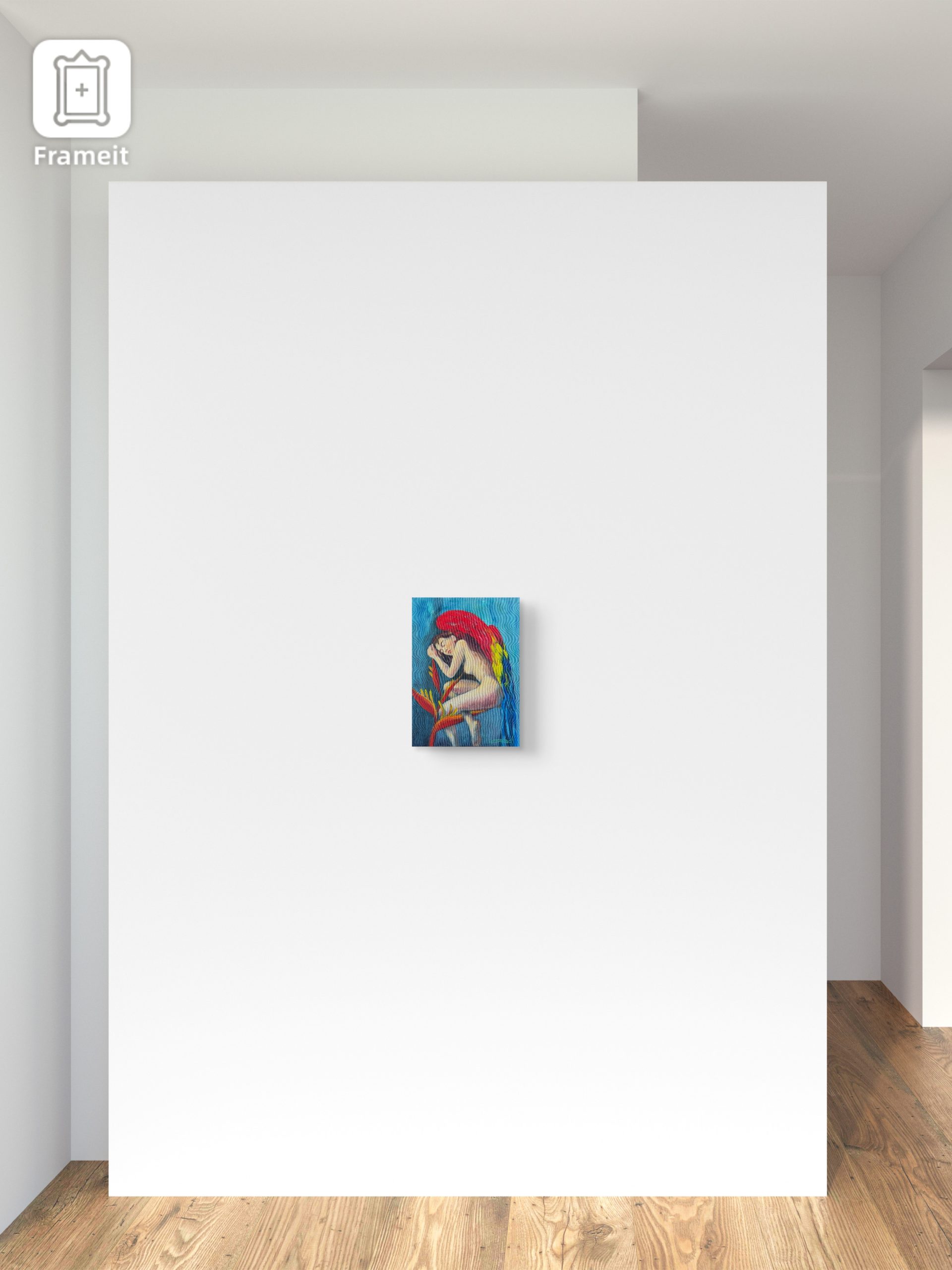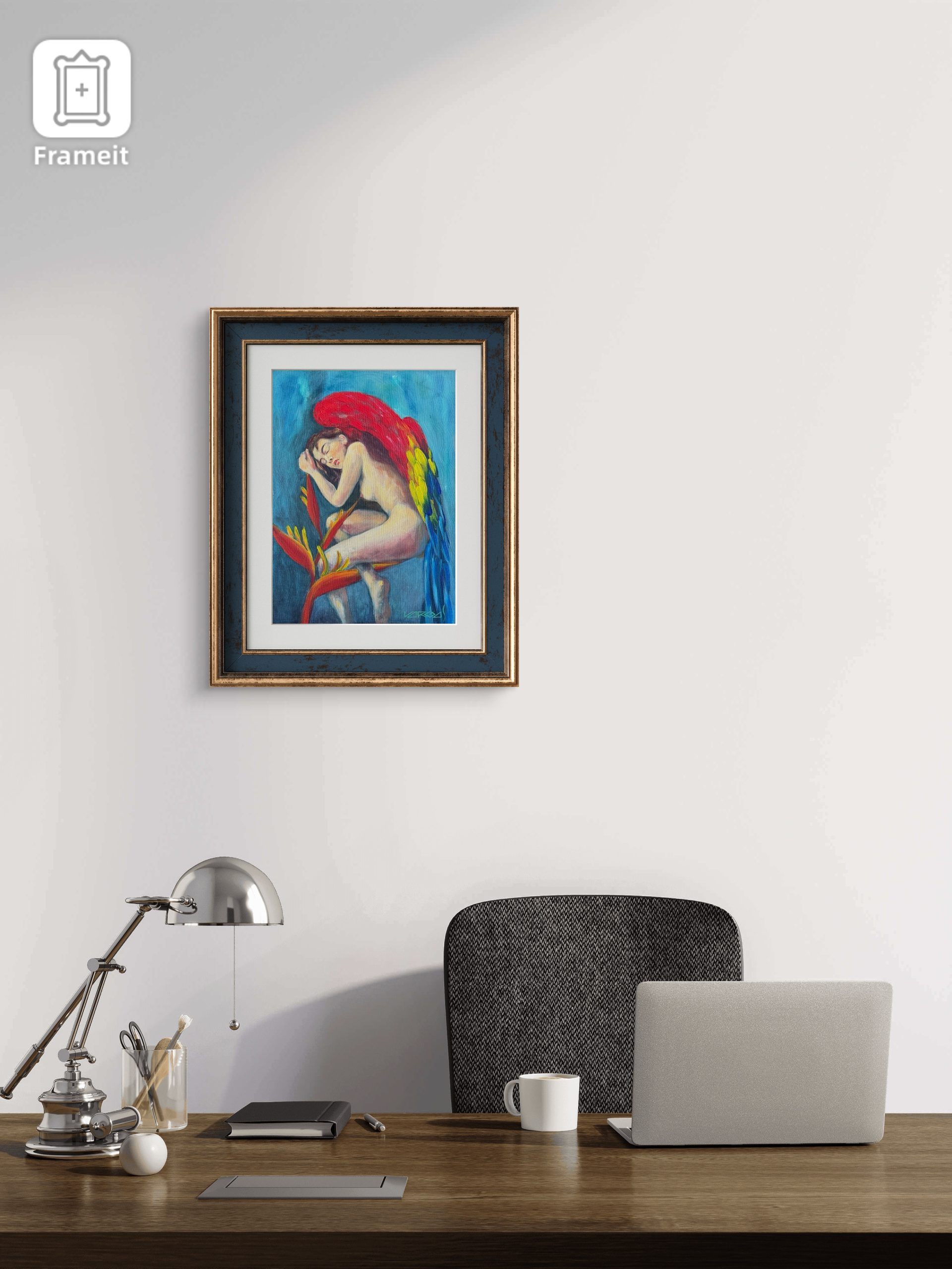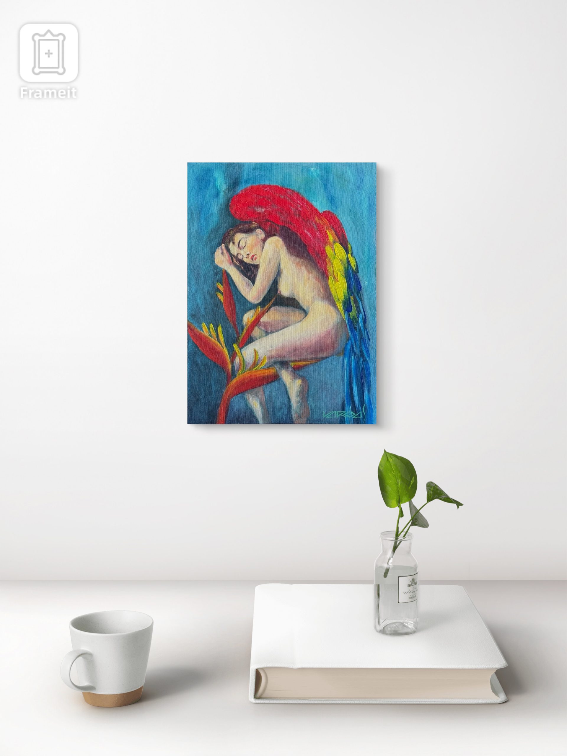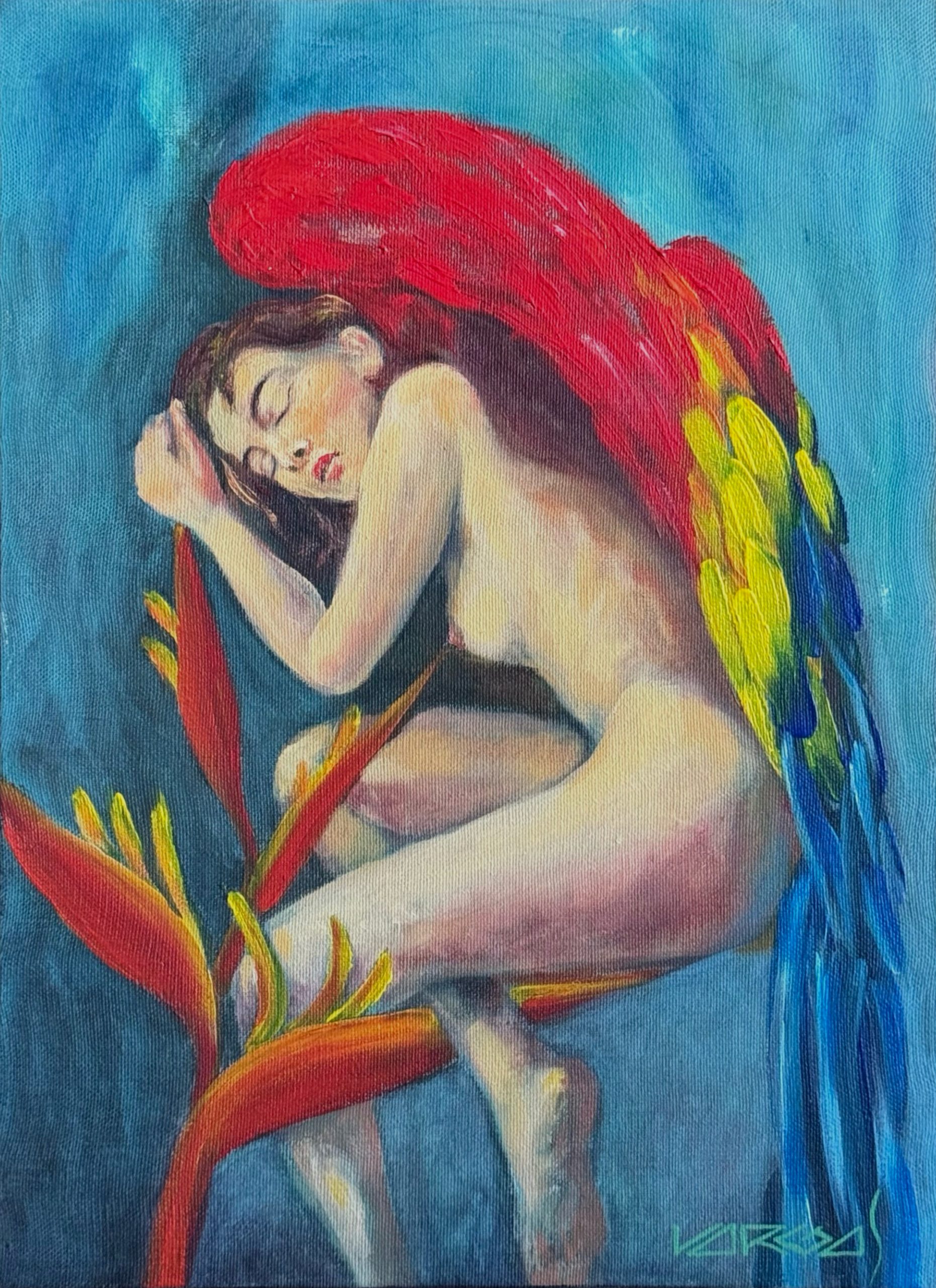 Pintura en acrílico elaborada sobre fondo de lienzo templado en bastidor. Muestra una composición en relación a 3 actores, heliconia mujer, alas de guacamaya. El autor busca una escena fantástica, con elementos realista, tranquila.